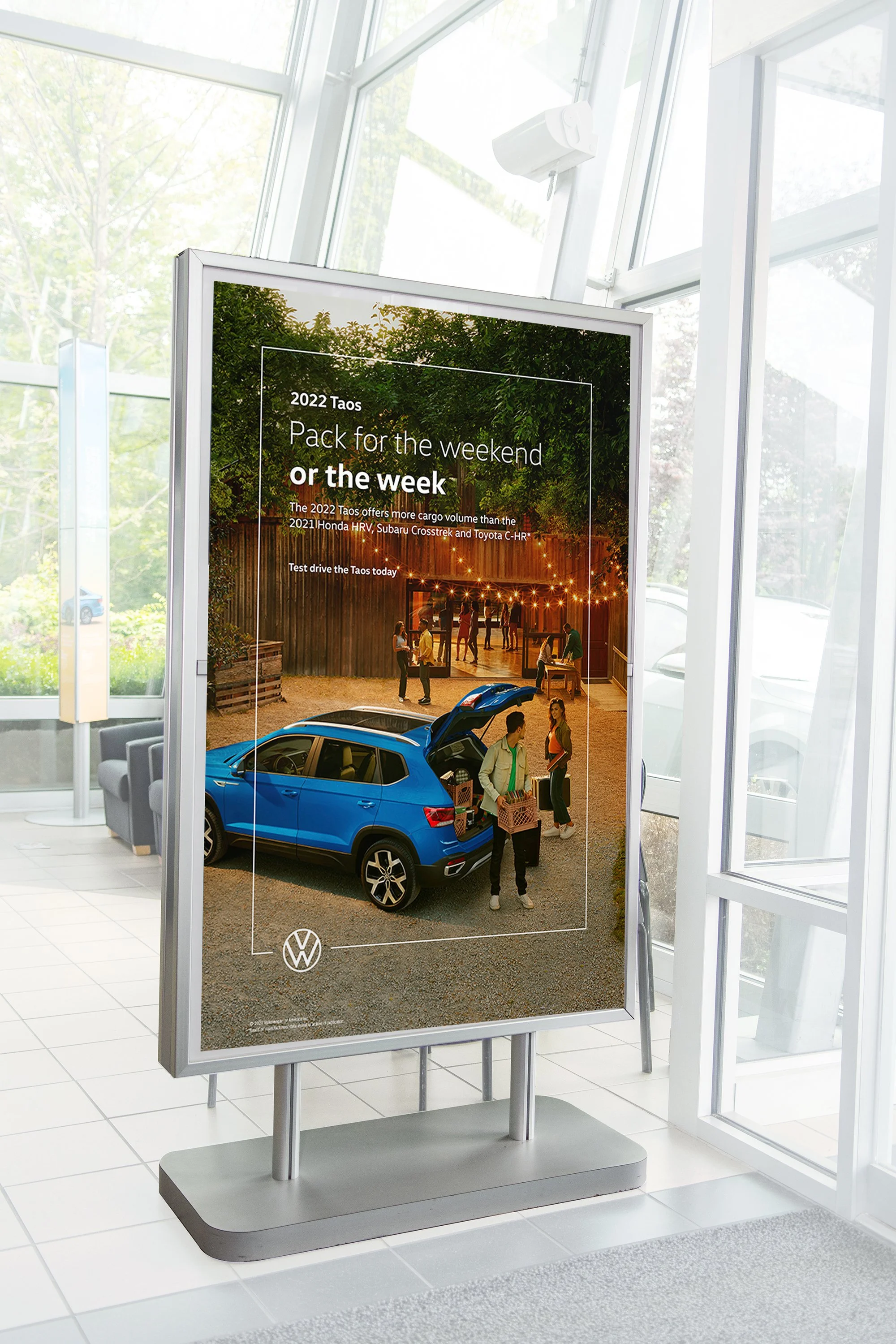 Each Taos launch kit included everything dealerships needed to bring the campaign to life—from showroom posters and large-format graphics to a monitor-ready sizzle reel. The accompanying letter outlined the contents, provided installation guidance, and offered tips for creating consistent, high-impact displays throughout the dealership. Clear, friendly copy kept setup simple while reinforcing VW’s approachable, confident tone.